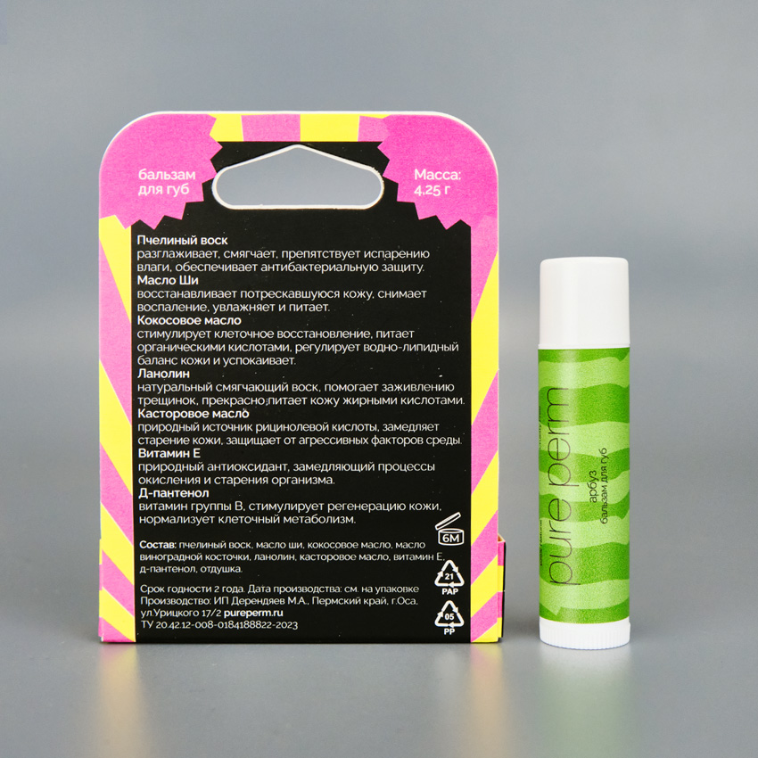 Натуральный бальзам для губ с пчелиным воском Pure Perm Арбуз